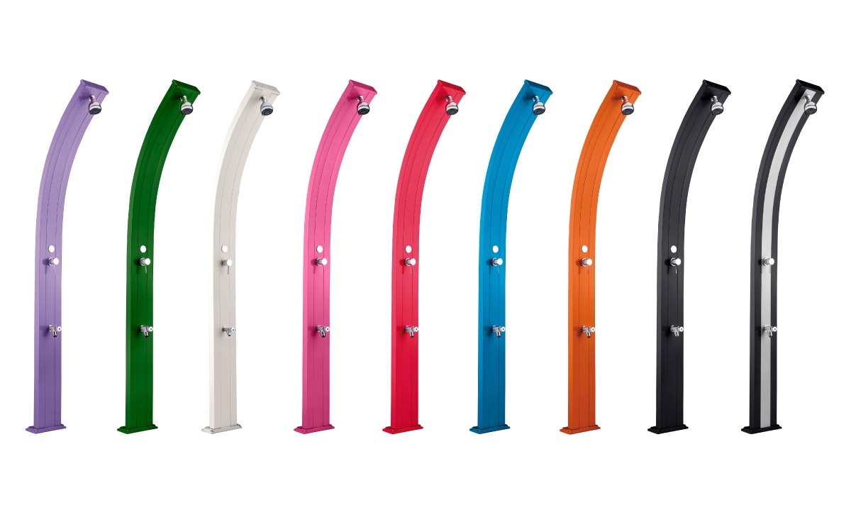 Solární sprchy z kolekcí Big Happy, Spring i Fantasy Rain se samonosnou konstrukcí skrývající zásobník vody i solární kolektor vám zajistí dostatek vody na vaše osvěžení, jejíž teplotu lze korigovat. Ať už si vyberete barevně lakované hliníkové provedení, nebo dáte přednost klasice v antracitové barvě, vždy dostanete sprchu vysokou přes dva metry, s hlavicí a kohouty v chromovém provedení a s kohoutkem pro opláchnutí nohou.